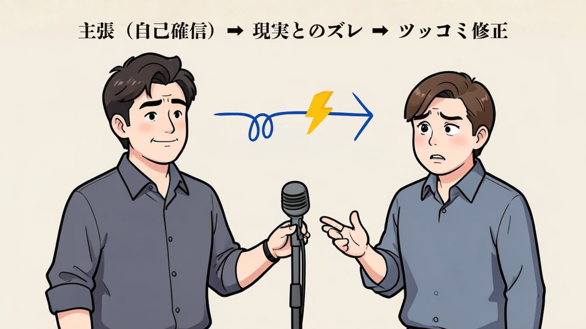 ズレたまま成立する世界を作り、観客の「分かる」「あるある」を回収して笑いに変えます。